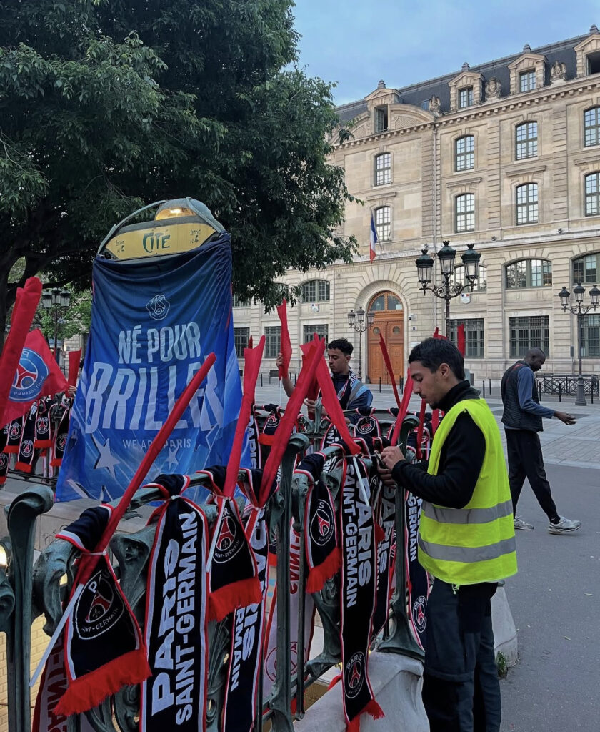 • Des drapeaux, écharpes et éléments de branding PSG sur les rampes et barrières,